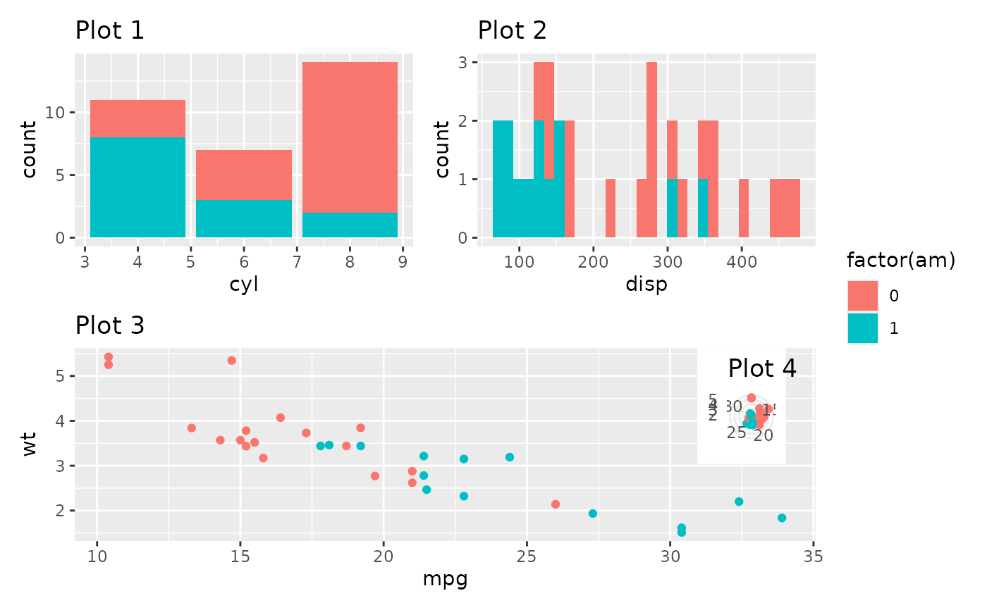 order = c(3, 1), the second plot is not shown.By default, the first plot returned by this function is blank, showing layout elements of the patchwork but none of its child plots. To omit the blank plot, include